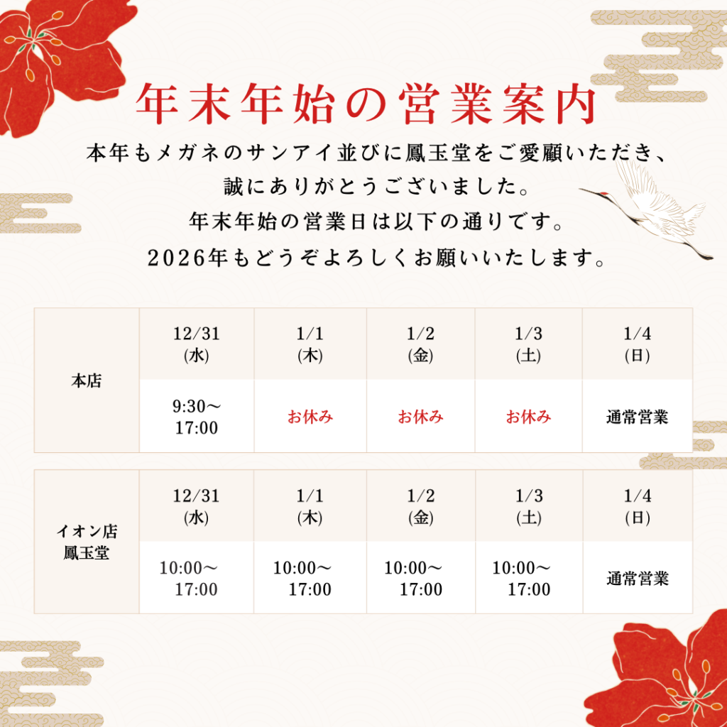 本店は明日は17時まで営業、新年は4日より通常営業、 イオン店は年末年始も休まず営業、12月31日より1月3日までは17時閉店となります。